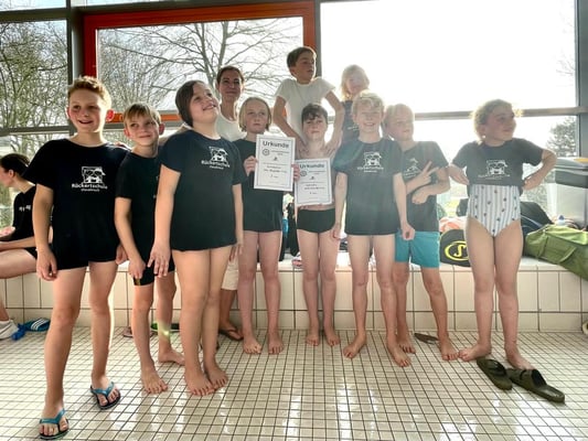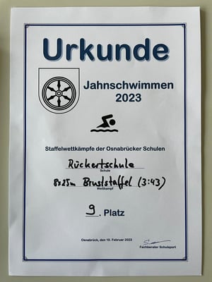 Beim diesjährigen Jahnschwimmen im Nettebad zeigten unsere Rückert-Haie wieder vollen Einsatz. Nach 2 Jahren Coronapause war die Aufregung groß und das Event umso schöner! Unsere Sportlehrerin Frau Wurth hatte die Kinder trainiert und zum Wettbewerb "Jahnschwimmen 2023" begleitet. Auch die Eltern Frau und Herr Schenk, Frau Lachmann, Frau Bruekhuisen, Frau Kehl und Frau Metrevelli unterstützten die Kinder tatkräftig bei diesem Ereignis. Dafür herzlichen Dank! Bei der Bruststaffel belegten die sportlichen SchwimmerInnen schließlich Platz 9 und beim Freistil sogar Platz 7 des Wettbewerbs. Mit dabei waren Aurelie Lachmann, Thea Metrevelli und Paul Lauxtermann aus der 3a, Christin Kehl, Joris Bruekhuisen und Leo Burock aus der 3b sowie Marie Meyer, Luca Fillies, Otto Schenk und Giorgi Nergadze aus der 4a! Wir sind stolz auf euch!!! Weitere Infos findet man im Noz Artikel https://www.noz.de/sport/lokalsport-region-osnabrueck/artikel/spass-und-sport-osnabruecker-jahnschwimmen-startet-wieder-durch-44127748?wlct=AEnaSHmJpDU1Ho21v1GCxruLR9LDkHCOrw%3D%3D