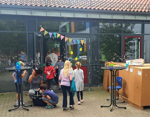 Bei bestem Sommerwetter wurde am Montag, 05.08.2024 das Eröffnungsband durchschnitten und erstmals strömten ca. 100 Kinder aus der Elisabeth- und Rückertschule zusammen in die vier Esszimmer. Im Anschluss an das Mittagessen gab es diese Woche noch keine Hausaufgabenzeit, da unter der Überschrift „zusammen+ankommen“ zunächst das Kennenlernen der Menschen, neuen Strukturen und Räume sowie das gemeinsame Spiel im Mittelpunkt standen. Außerdem gab es verschiedene offene Angebote. Auch unsere Kooperationspartner wie Bakos und Kunstraum29 waren vor Ort und luden die Schülerinnen und Schüler ein. Die Bilder zeigen, wie fröhlich und gelungen unser Start war.