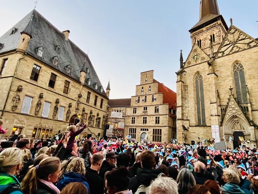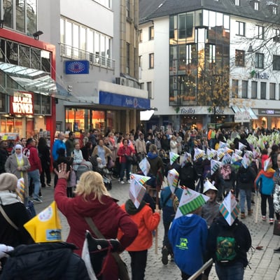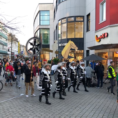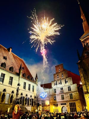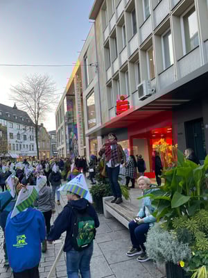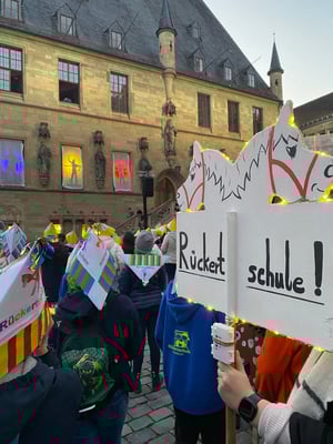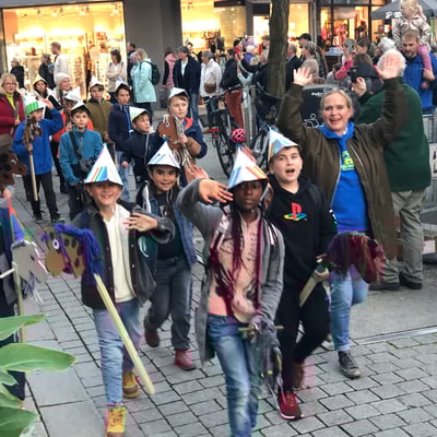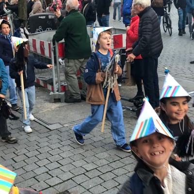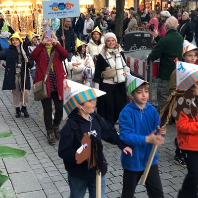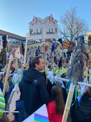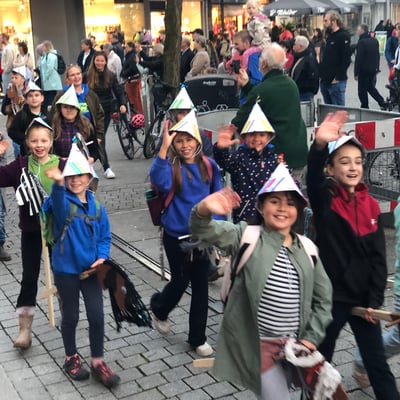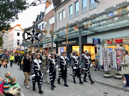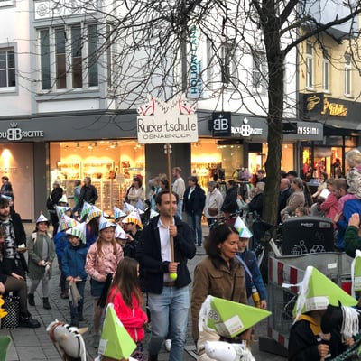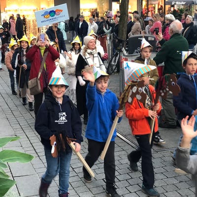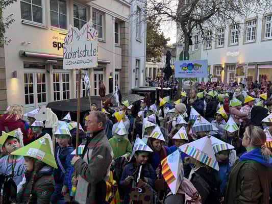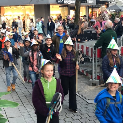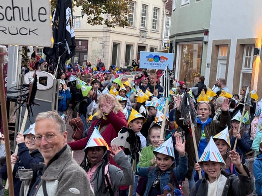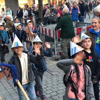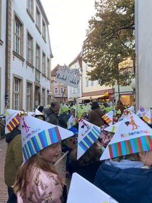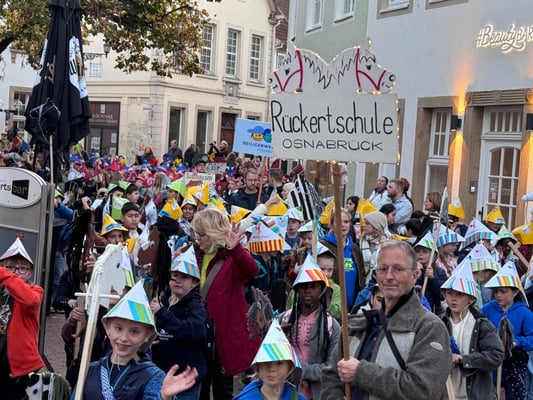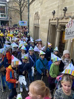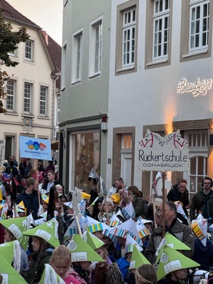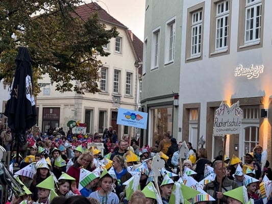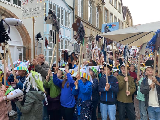 Am 25. Oktober war es für unsere ViertklässlerInnen so weit: Das ersehnte Steckenpferdreiten fand endlich statt! Mit Liebe und Sorgfalt hatten die Kinder im Werk- und Textilunterricht ihre Steckenpferde und Hüte gebastelt und durften diese nun voller Stolz mit über 1400 Kindern in der Osnabrücker Innenstadt präsentieren. Unsere SchülerInnen waren im Sachunterricht fundiert auf dieses wichtige Friedensfest vorbereitet worden und wussten sehr genau, welche wichtige Tradition sie gerade in der heutigen Zeit fortführen. So ging es dann bei bestem Wetter singend durch die Innenstadt, vorbei an zahlreichen Zuschauern und Musikkapellen, die den Weg säumten. Mit bester Laune erreichten die Rückerts den Marktplatz, wo sie die heiß begehrte Brezel auf der Rathaustreppe entgegennahmen. Nach dem Farben- und Lichterspiel in den Rathausfenstern war der Höhepunkt wie immer die Feuerjonglage und das große Feuerwerk. Man muss einfach einmal im Leben als Osnabrücker Kind dabei gewesen sein, um den Frieden zu zelebrieren, sonst hat man etwas Wichtiges in der Grundschulzeit verpasst...