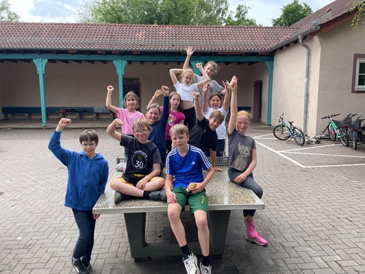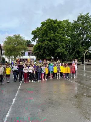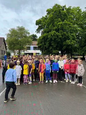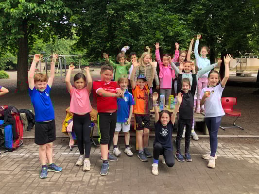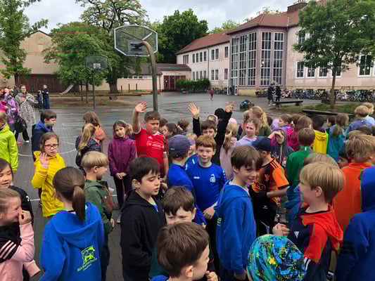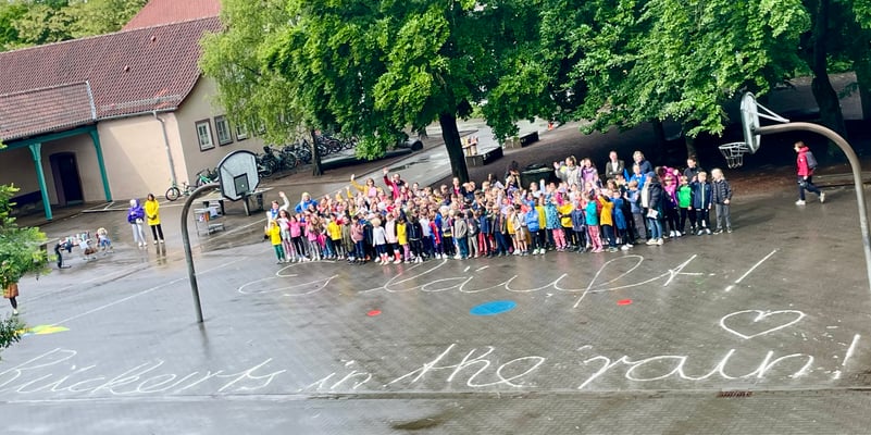 Bis 5 Minuten vor Beginn des diesjährigen Laufabzeichens dachten die Rückertkinder noch, dass sie dieses Mal in Regenjacke und Gummistiefeln ein "Walking-in-the-rain"-Abzeichen absolvieren, aber es kam ganz anders. Nach einem ordentlichen Regenguss brach der Himmel auf und es blieb trocken. Da hatte die Hausaufgabe genutzt, ganz fest die Daumen für gutes Wetter zu drücken.