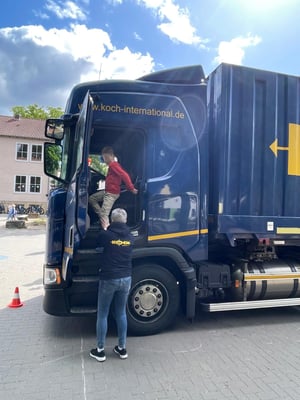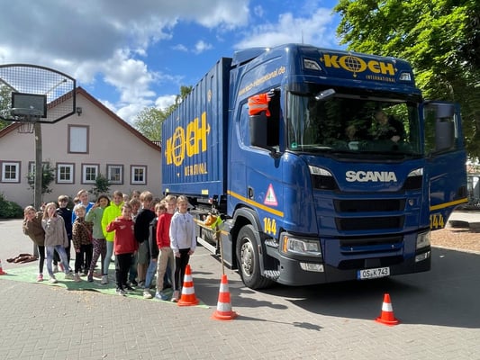 Für die 3. Klassen fuhr ein riesiger LKW der Spedition Koch auf unseren Schulhof. Ziel war es, den Kindern den "Toten Winkel" ganz praxisnah zu erläutern. So durften die Kinder alle einmal in die Führerkabine des LKWs, um aus der Sicht des Fahrers in den Rückspiegel zu blicken. Die SchülerInnen konnten erkennen, dass eben nicht immer alles zu sehen ist, was sich hinter dem LKW befindet. Dort, im sogenannten "Toten Winkel" - hatte sich die gesamte Klasse aufgestellt und war trotzdem nicht zu sehen. Mit diesem A-ha Erlebnis hofft die Spedition, dass die Kinder sich zukünftig im Straßenverkehr daran erinnern und mit ihrem Fahrrad eben nicht in diesem Bereich hinter einem LKW zum Stehen kommen. Wir danken der Spedition Koch für diese praxisorientierte Erfahrung.