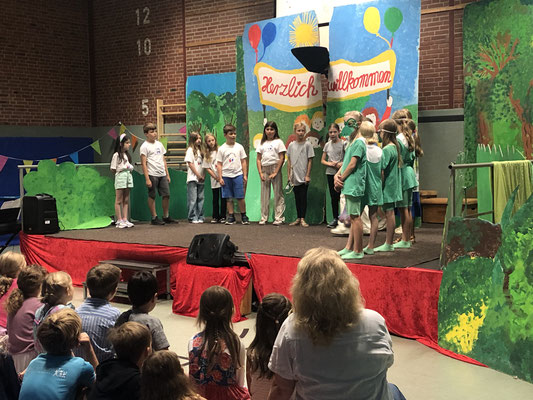 Am 16. August gab es in der Rückertschule wieder zwei tolle Einschulungsfeiern - dieses Mal waren sogar kleine Krokodile dabei - aber der Reihe nach: Los ging es um 9 Uhr mit der Klasse 1a und ihrer Klassenlehrerin Frau Rissling. Nachdem die aufgeregten I-Männchen in der vorderen Reihe Platz genommen hatten, wurden sie und ihre Familien von unserer Schulleiterin Frau Kohlmeyer herzlich begrüßt und durften sich ein kleines Theaterstück anschauen. Dieses hatte unsere pädagogische Mitarbeiterin Frau Hindersmann mit den jetzigen 4. Klassen im Rahmen der Theater-AG einstudiert. Hier begegneten Schulkinder 4 kleinen Krokodilen, die auf dem Weg zum Schwimmunterricht den falschen Weg genommen hatten und mit einigen Rückertkindern Verstecken spielen wollten. Wie sich herausstellte, konnten die Tiere aber noch gar nicht richtig zählen. In einem Zahlenlied brachten die Schulkinder den Reptilien ganz schnell das Zählen bei, bevor die ZoowärterInnen die ausgebüchsten Tiere wieder einfangen konnten. Der Plan war jedoch, die Kinder bald wieder in der Rückertschule zu besuchen, denn wie die Kinder in einem weiteren Lied bekräftigten: "Schule macht einfach Spaß!"
