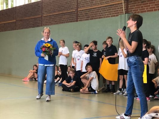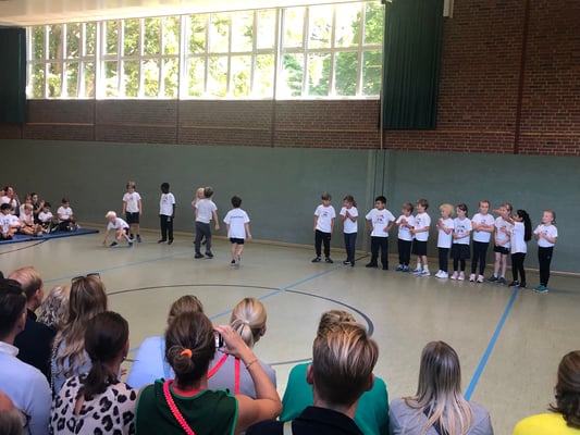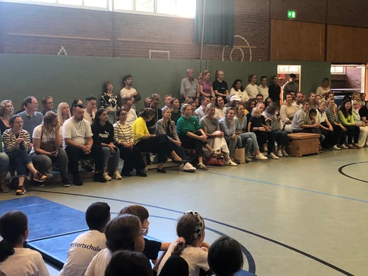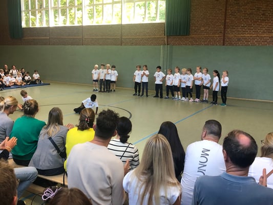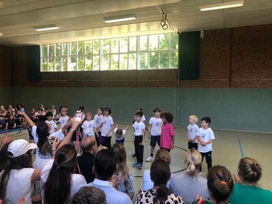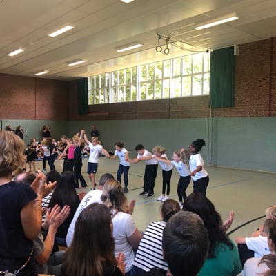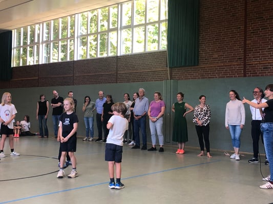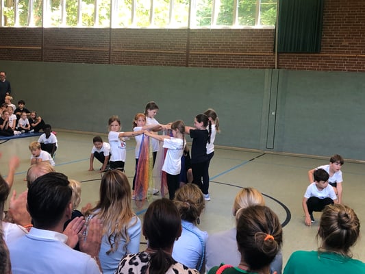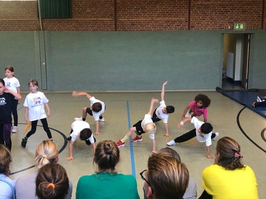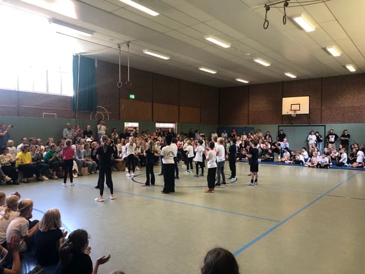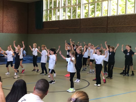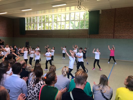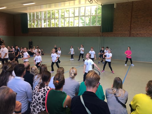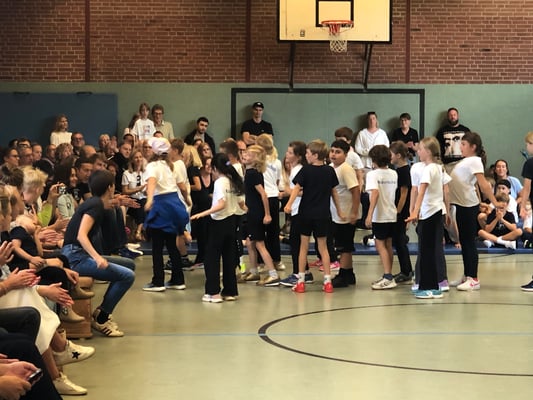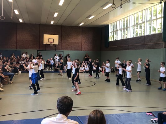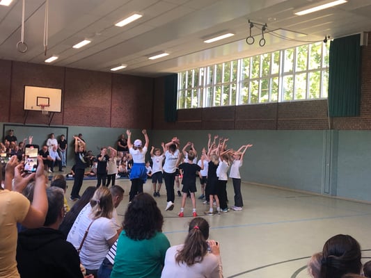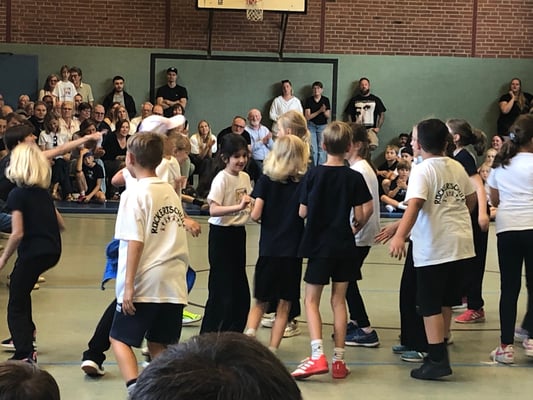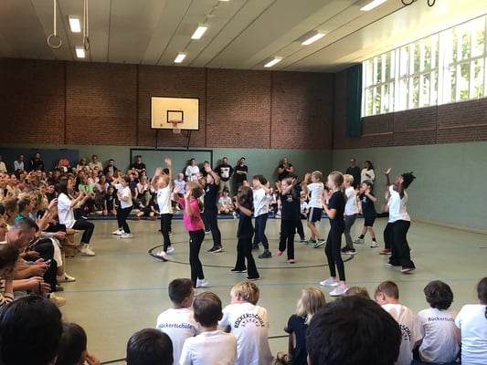 Von Montag bis Freitag hieß es in der Rückertschule: Zeigt eure coolsten Tanz-Moves, bewegt euch und haltet zusammen! Mit den Tanzlehrerinnen Susi und Elli von Wir bewegen Schule – mit einer Tanzwoche durften alle Kinder der Klassen 2 - 4 täglich zwei Stunden lang einen Tanzworkshop erleben, um einen eigenen Klassentanz zu erlernen, in dem auch viele individuelle Parts der Kinder eingebaut wurden. Am letzten Tag fand dann eine große Aufführung für die Familien in der Turnhalle statt, bei der alle Tänze aufgeführt wurden. Hier wurde gestaunt, geklatscht und mitgewippt, als die Kinder professionell, stolz und voller Freude ihre gelernten Performances ablieferten. Die Stärkung der Klassengemeinschaft war dabei ein toller Nebenaspekt, der ganz deutlich spürbar war. Finanziert und realisiert werden konnte das Projekt durch den tollen Förderverein unserer Schule! Wir sind dankbar, dass wir diese Gelegenheit nutzen und die Kinder glücklich machen konnten.