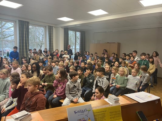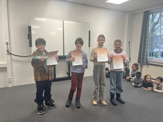 Alle Kinder, die mitgemacht hatten, bekamen eine Urkunde und ein kleines Kartenspiel. Besonders gut platzierte SchülerInnen wurden nach vorne gerufen und bekamen zusätzliche Präsente aus den Händen der Organisatorinnen Frau Franke und Frau Kocak.