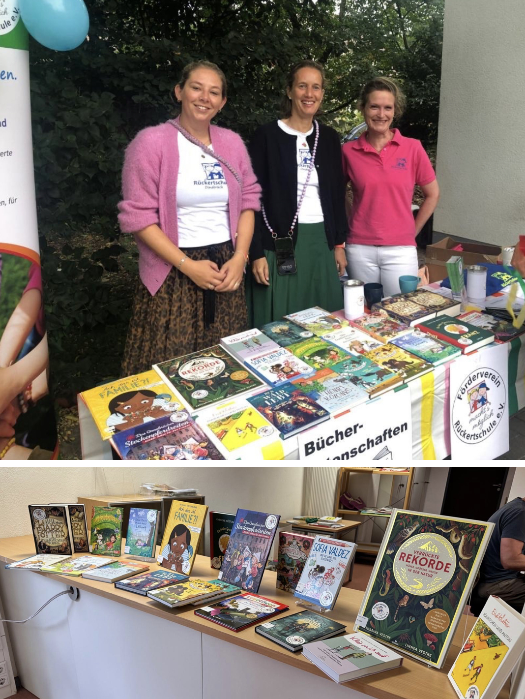 Beim Infostand des Fördervereins konnten sich Interessierte im Rahmen der Einschulung über die Arbeit des Vereins informieren und unsere Rückert-T-Shirts und Hoodies erwerben. Aysel Otten und Ute Middendorp vom Vorstand des Fördervereins hatten zudem noch einige Bücher für die Zielgruppe 1. und 2. Klasse im Gepäck. Hier konnten zahlreiche Bücherpatenschaften vermittelt werden, d. h. Spender*innen haben sich an den Anschaffungskosten des Buches beteiligt und konnten sich dann als Bücherpate/patin im Buch eintragen. Die Restsumme hat der Förderverein noch oben draufgelegt, so dass elf neue Bücher an die Schule übergeben werden konnten. Wir wünschen viel Spaß beim Lesen!